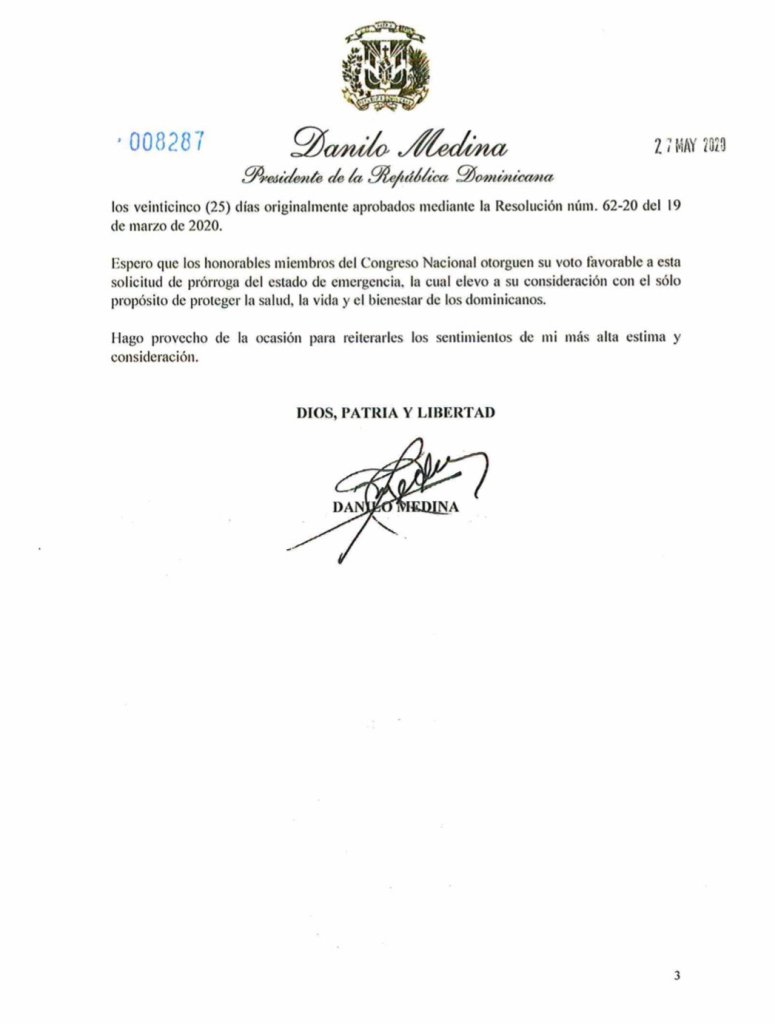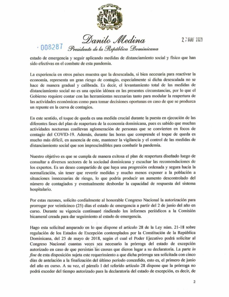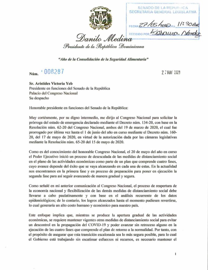 El presidente Danilo Medina solicitó al Congreso Nacional prorrogar el estado de emergencia por 25 días, a partir del 2 de junio, para continuar avanzando en la desescalada gradual y segura por fases del distanciamiento social y de reapertura de la economía.