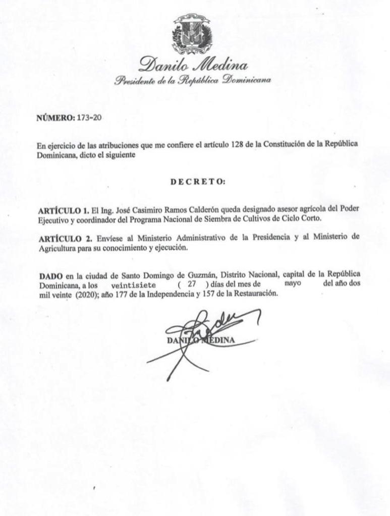 El presidente Danilo Medina designó a José Casimiro Ramos Calderón asesor agrícola del Poder Ejecutivo y coordinador del Programa Nacional de Siembra de Cultivos de Ciclo Corto, mediante el decreto 173-20.