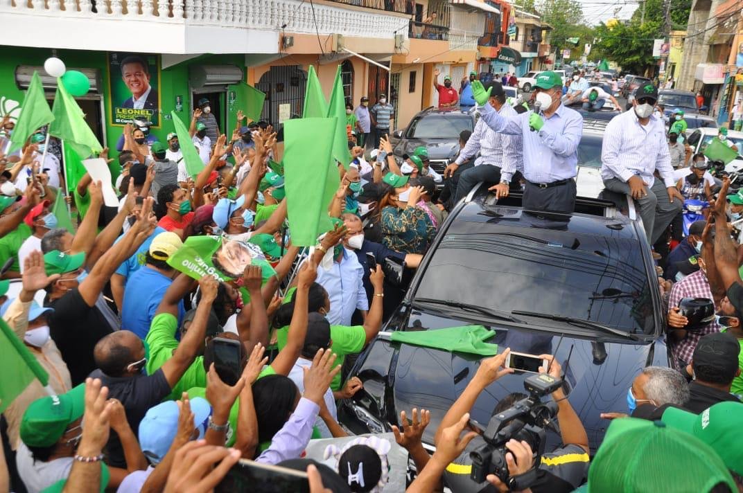 Miles de ciudadanos con sus mascarillas puestas abarrotaron las calles de los municipios de Santo Domingo Este y Norte, en donde se observó a hombres, mujeres y jóvenes en los balcones con banderas y pancartas alusivas al líder de la Fuerza del Pueblo.