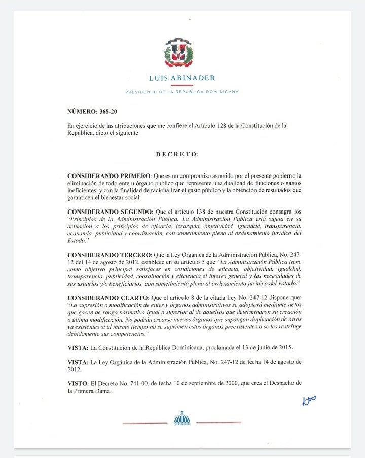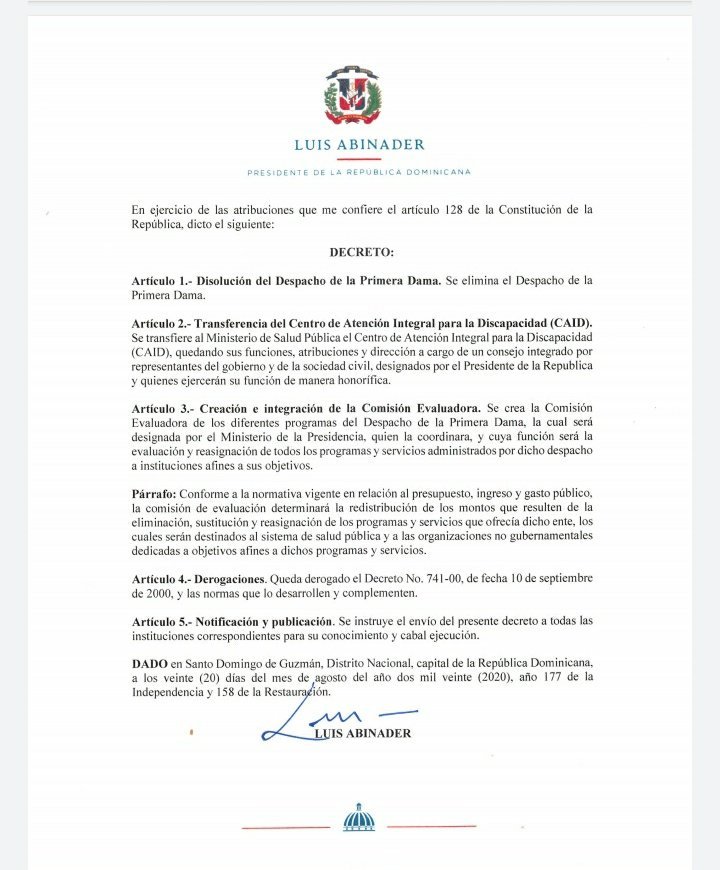 Mediante el decreto 368-20 el presidente @luisabinader disuelve el Despacho de la Primera Dama. pic.twitter.com/r32ZkTrrpg