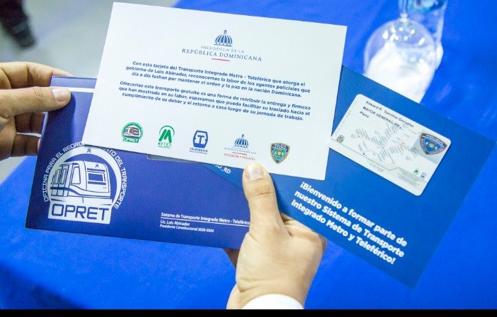 SANTO DOMINGO.- La Oficina para el Reordenamiento del Transporte (OPRET), hizo hoy entrega formal de las primeras tarjetas de viaje que permitirán a los agentes policiales desplazarse en los sistemas de transporte masivo Metro y Teleférico de Santo Domingo, de forma gratuita, tal y como se había anunciado recientemente junto al Ministerio de Interior y Policia.
