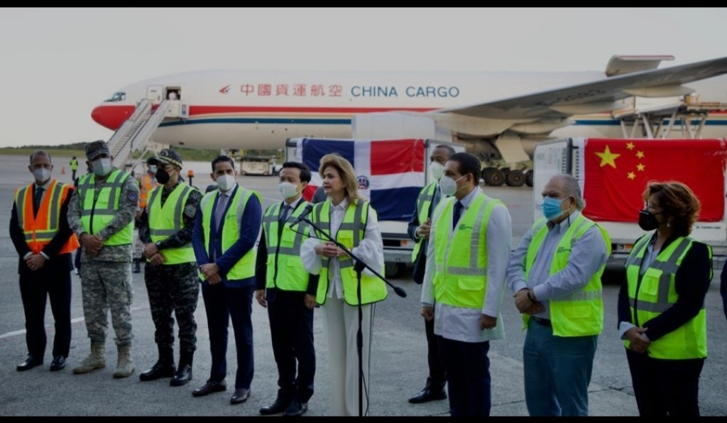 El avión de China Cargo, que arribó al país desde Pekín, a las 5:07 de la tarde, fue recibido por la vicepresidenta de la República, Raquel Peña, en el aeropuerto internacional Las Américas, Dr. José Francisco Peña Gómez.