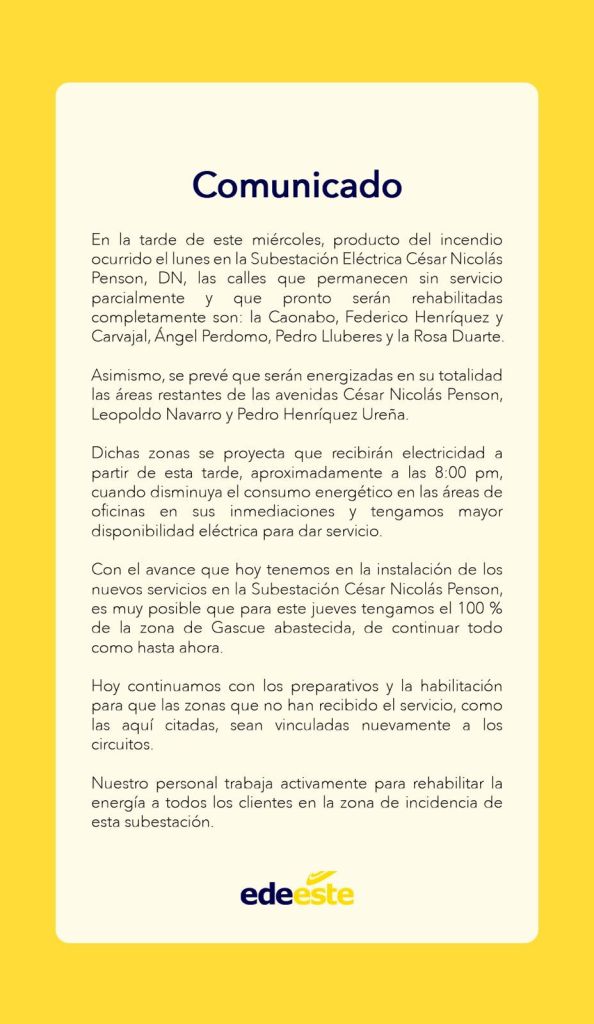 Con el avance que hoy tenemos en la instalación de los nuevos servicios en la Subestación César Nicolás Penson, es muy posible que para este jueves tengamos el 100 % de la zona de Gascue abastecida, de continuar todo como hasta ahora.