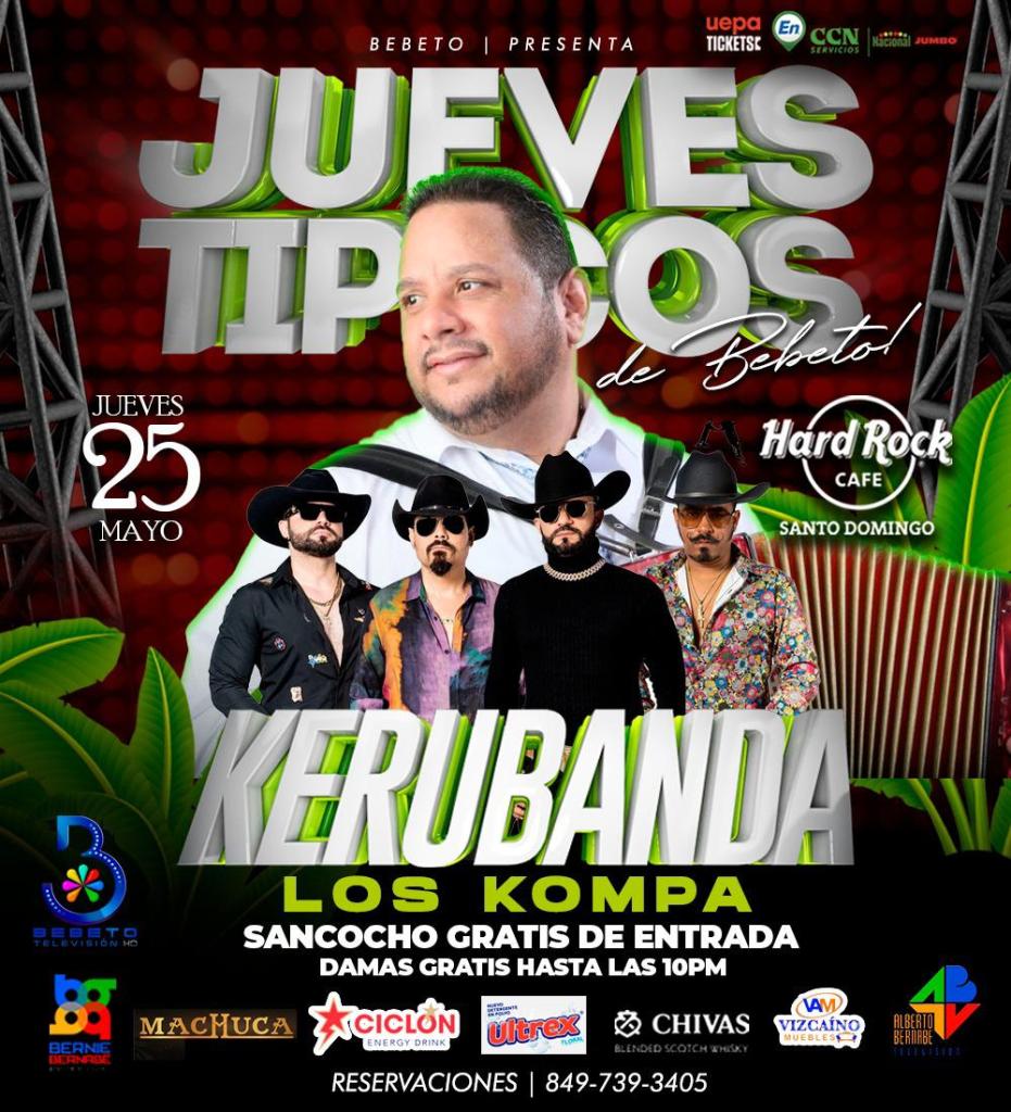 SANTO DOMINGO.- La orquesta de música típica Kerubanda se presentará este jueves 25 de mayo en el Hard Rock Café Santo Domingo, en la continuación de “Los Jueves Típicos con Bebeto”, actividad que ha sido pautada para iniciar a partir de las 9 de la noche.